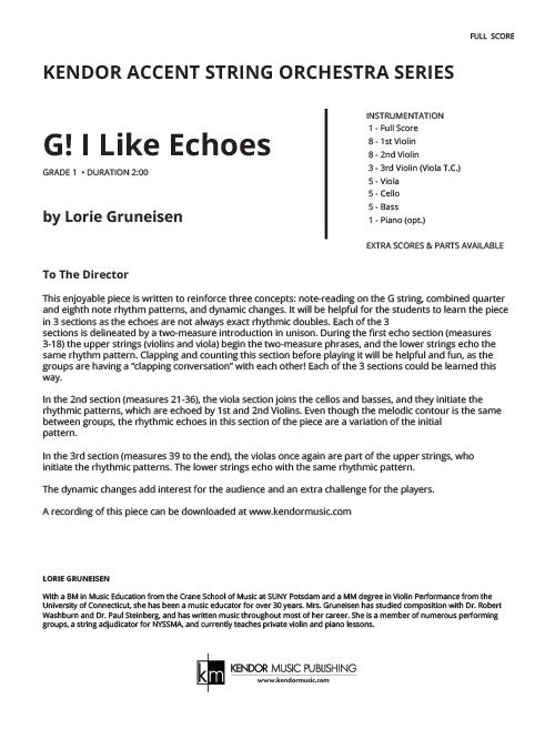 This lively piece focuses on three concepts: note-reading on the G string, combined quarter and eighth note rhythm patterns, and dynamic changes. Written in echo style, it's lots of fun to play and hear. Duration 2:00. Available in SmartMusic.