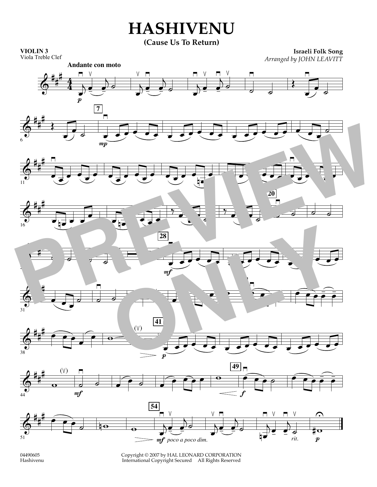 A traditional Israeli folk song with text from the Bible, Hashivenu means Cause Us to Return, and is scored sensitively for strings in this stirring rendition by John Leavitt. Here's a chance to give your students the opportunity to perform and understand some meaningful, cultural music from another land. Dur: 2:40