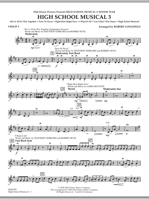 This medley for string orchestra from High School Musical 3: Senior Year includes: We're All in This Together, Now or Never, Right Here Right Now, I Want It All, Can I Have This Dance and High School Musical.