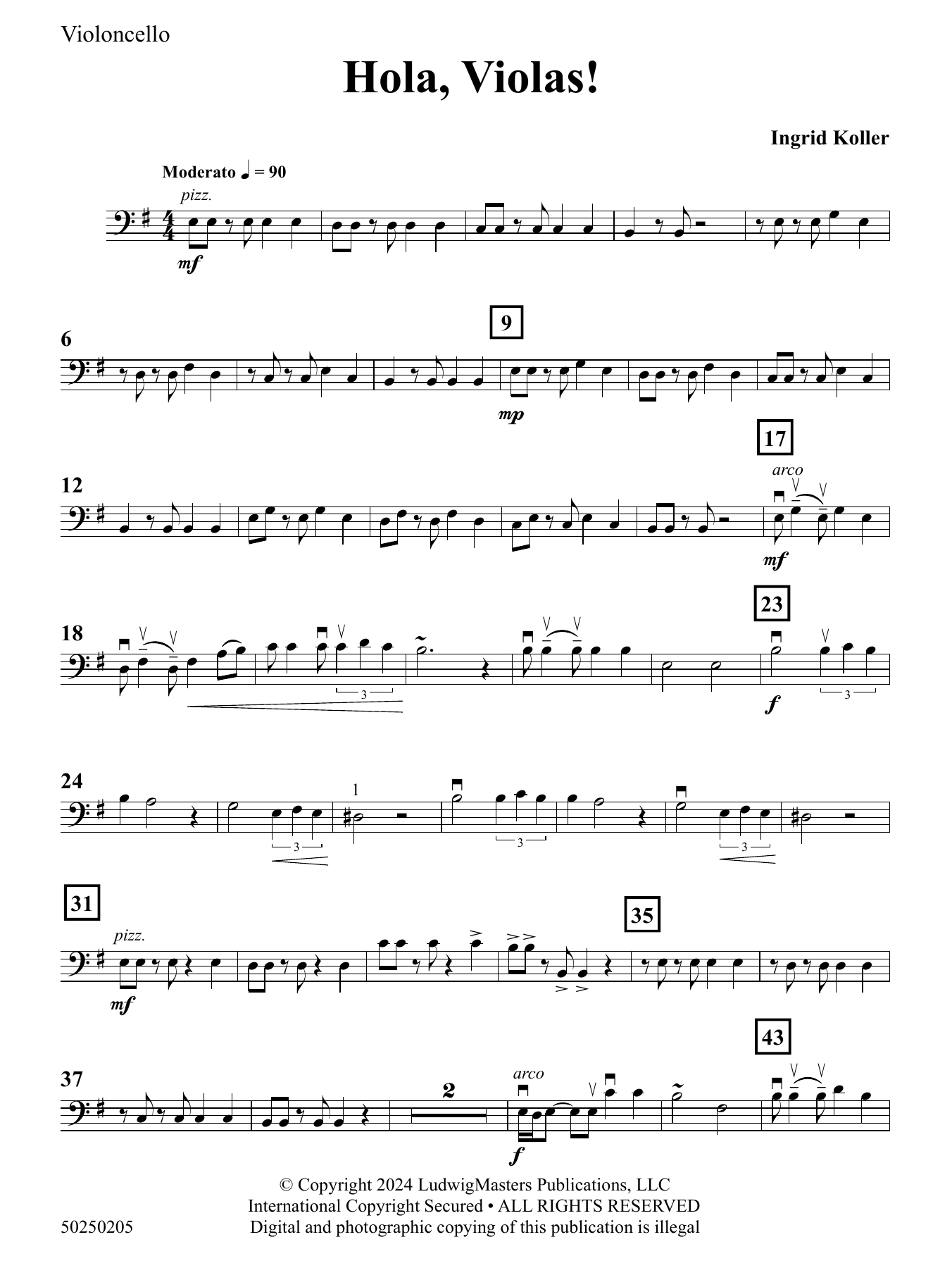 Hola, Violas is an excellent way to highlight the viola section in your orchestra. The words, "hola, violas" provide the samba rhythm on which the piece is based. The piece is in E minor and its harmonies are based on the Spanish Andalusian chord progression often used in traditional Flamenco dances. The rhythms in this piece provide an excellent way to work on syncopation and bowing skills, and in addition, there is plenty of pizzicato to keep things lively and interesting. (4:00)