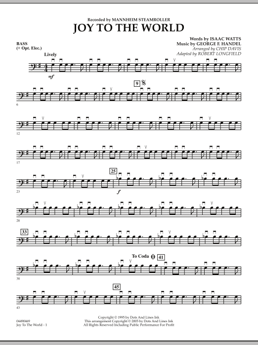 Now available for string orchestras, Joy to the World is one of the distinctive arrangements of Chip Davis and Mannheim Steamroller. Players and audiences love these contemporary pop versions that dominate the airwaves during the holidays, adapted here by Robert Longfield.
