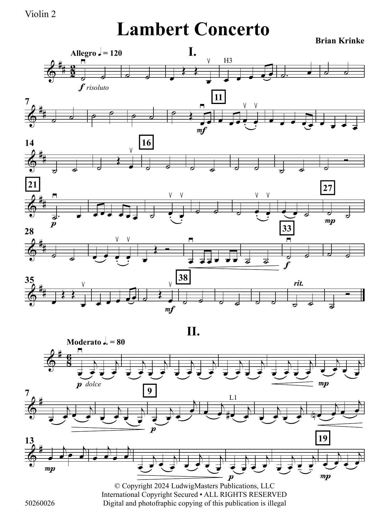 The Lambert Concerto is an original work by Brian Krinke, perfect for young violin students ready to tackle their first concerto. It was written for one of Krinke's talented violin students whose father was a composer as well. It has been performed successfully by a number of violin students, and this new string orchestra accompaniment has allowed the composer the opportunity to expand some of the harmonies, as well as for the student to perform the work with their peers. (4:00)
