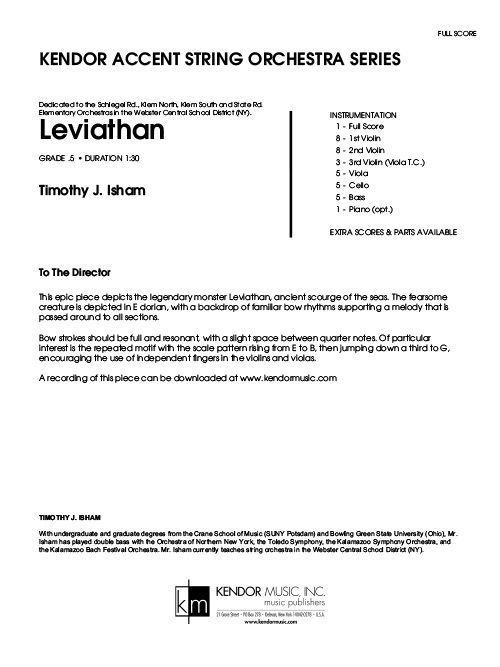 This epic piece depicts the legendary monster Leviathan, ancient scourge of the seas. The fearsome creature is depicted in E dorian, featuring familiar bow rhythms supporting a melody that is passed around to all sections. Duration 1:30. Available in SmartMusic