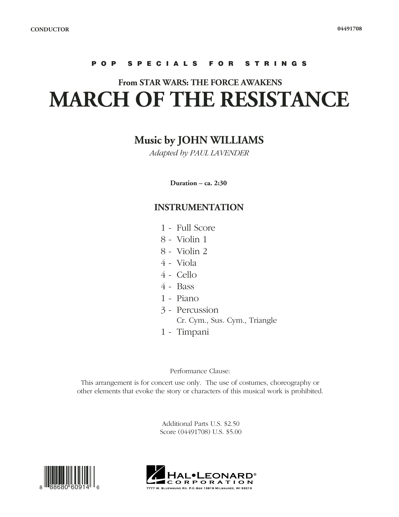 From the blockbuster film Star Wars: The Force Awakens, this distinctive march theme gives string orchestras a terrific concert work that features skilled contrapuntal and fugal style writing. A challenging yet fun experience that mixes early Baroque and Classical style with the power and drama of Star Wars.