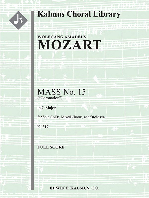 Wolfgang Amadeus Mozart (1756-1791) vollendete seine Messe Nr. 15 in C, KV 317 am 23. März 1779, nachdem er sich unter anderem in Paris und Mannheim um eine Anstellung bemüht hatte. Als dies nicht gelang, verschaffte ihm Mozarts Vater Leopold eine Stelle als Hoforganist und Komponist am Salzburger Dom, wo diese Messe wahrscheinlich am Ostersonntag, dem 4. April 1779, uraufgeführt wurde. Den Beinamen Krönungsmesse erhielt das Werk im frühen 19. Jahrhundert, nachdem es bei königlichen und kaiserlichen Krönungen am Wiener Kaiserhof beliebt war. Da sie alle Abschnitte des Ordinarium enthält, kann diese leichtere Messvertonung als Missa solemnis betrachtet werden, obwohl sie aufgrund ihrer Kürze auch als Missa brevis eingestuft werden kann. Sätze: I. Kyrie, II. Gloria, III. Credo, IV. Sanctus, V. Benedictus, VI. Agnus Dei. Instrumentation: 0.2.0.2: 2.2.3.0: Pauke: Org: Str (4-4-0-3-3): Solo SATB: Mix Chor. (Mozart hat keine Partitur für Bratschen geschrieben.)