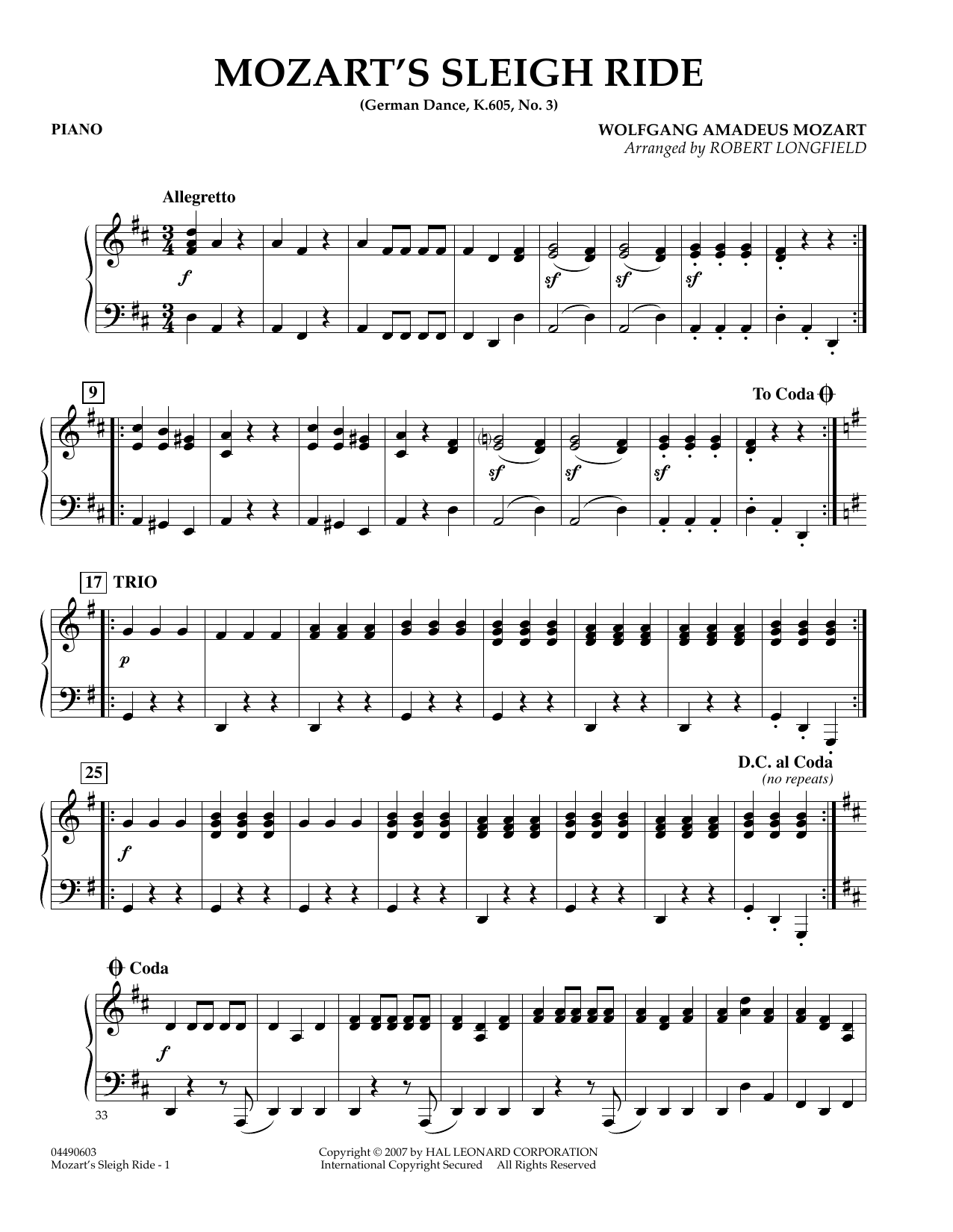 Robert Longfield's arrangement brings Mozart's musical charm to the holiday stage with this classical favorite (German Dance No. 3). In an easy, approachable 3/4 setting, it includes an optional sleigh bell part to add to the festive style. Dur: 3:15