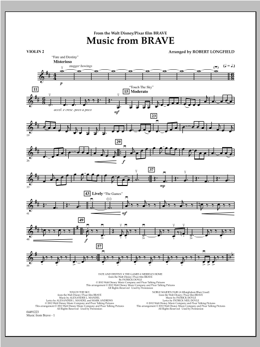 Featuring a marvelous blend of Celtic-flavored themes, Patrick Doyle's soundtrack from the blockbuster Disney/Pixar film Brave ranges in mood from haunting and lyrical, to powerful and majestic. Robert Longfield captures the stylebeautifully for string orchestra.