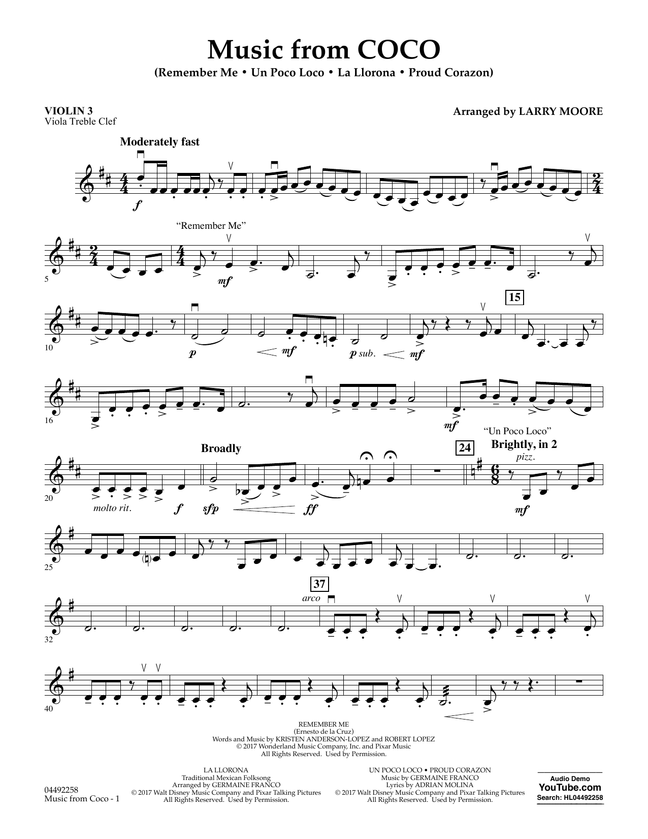 With four powerful new songs from the Pixar hit film, Larry Moore's medley captures the rich heritage and cultural flavor of Mexican folk music, heard throughout the movie's soundtrack. Includes Remember Me, Un Poco Loco, Lsa Llorona, Proud Corazon.