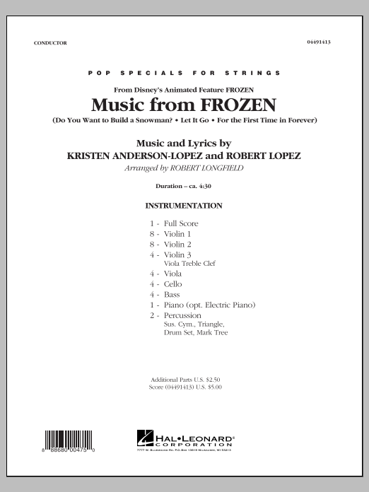 Die Filmmusik aus dem Disney-Film 'Die Eiskönigin - Völlig unverfroren' erfreut sich bei einem breiten Publikum großer Beliebtheit. Robert Longfield hat die die drei Songs 'Let It Go', 'Do You Want To Build A Snowman?' und 'For The First Time In Forever' auf kunstvolle Weise in einem Medley für Streichorchester verarbeitet.