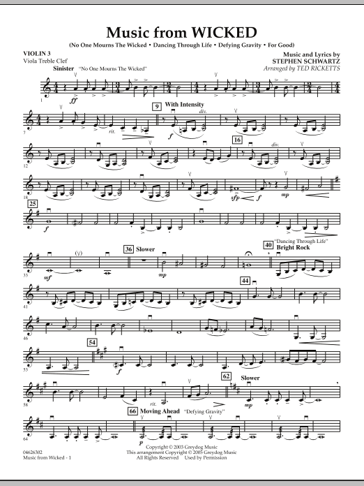 Here is a very playable, yet effectively powerful string orchestra setting of highlights from the hit Broadway musical about the Wicked Witch of the West. Includes: No One Mourns the Wicked, Dancing Through Life, Defying Gravity.