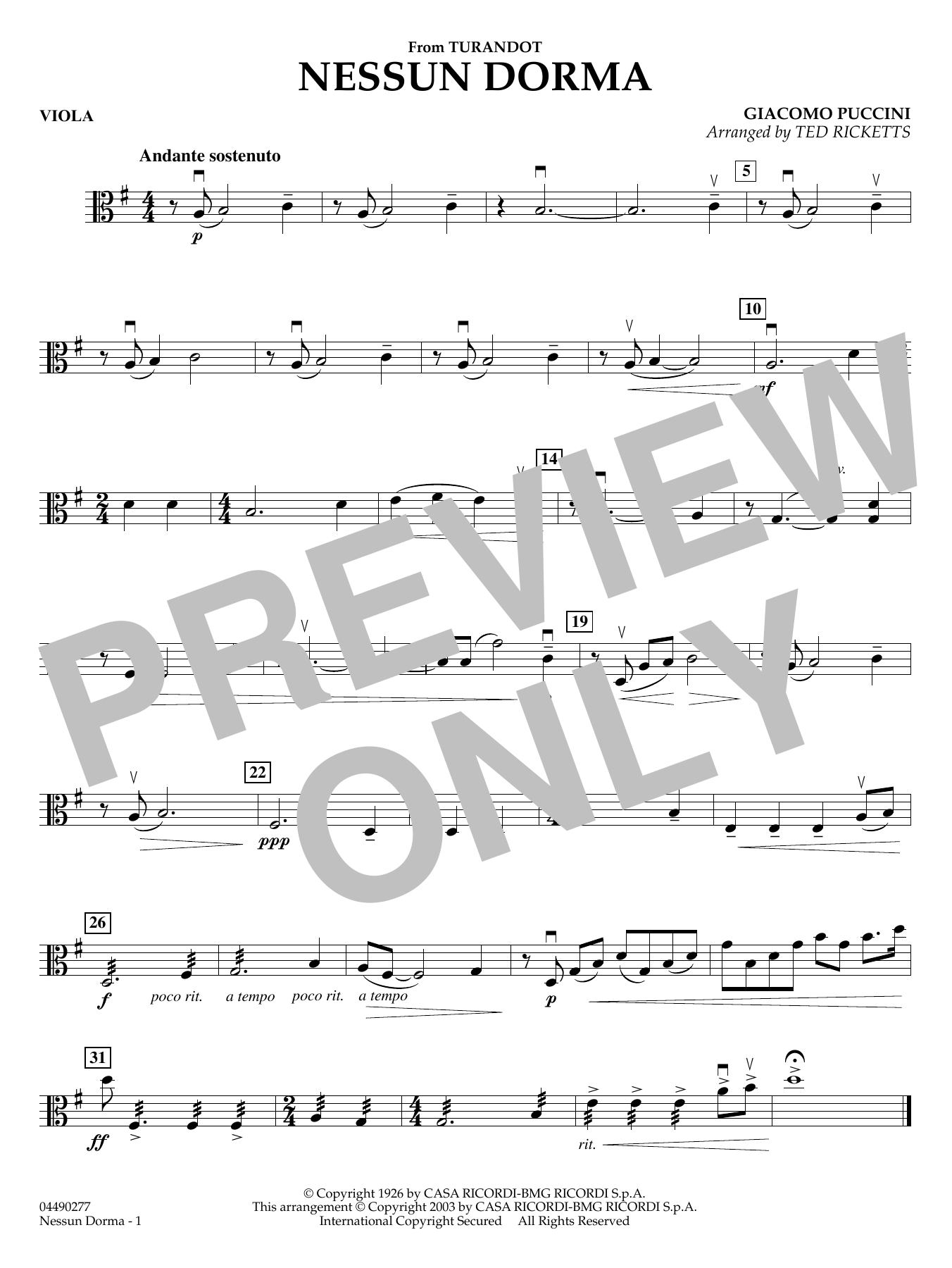 The singing style of Puccini's most famous aria translates wonderfully for string orchestra with this new arrangement by Ted Ricketts. This edition provides ample opportunity to teach both sensitive, expressive playing as well as powerful, dramatic style.