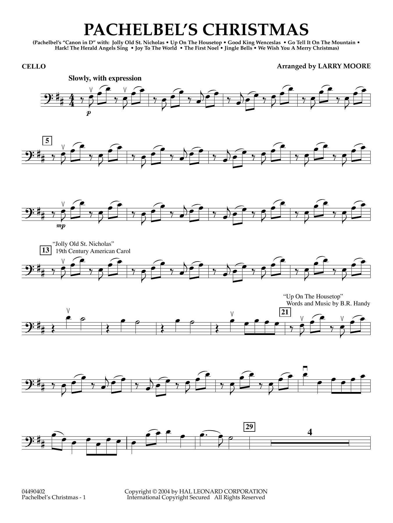 Larry Moore has created an ingenious combination of favorite carols and Pachelbel's most famous work into a clever holiday treat. Starting with the traditional ground bass and melody, he adds a delightful assortment of holiday tunes, with some that are not so obvious. Let your audience find them all while enjoying this creative arrangement. Includes: Jolly Old Saint Nicholas, Up On the Housetop, Good King Wenceslas, Go Tell It on the Mountain, Hark! The Herald Angels Sing, Joy to the World, The First Noel, Jingle Bells and We Wish You a Merry Christmas.