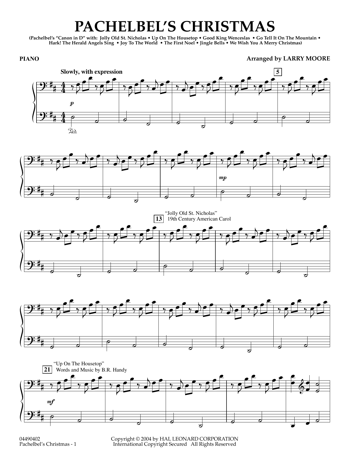Larry Moore has created an ingenious combination of favorite carols and Pachelbel's most famous work into a clever holiday treat. Starting with the traditional ground bass and melody, he adds a delightful assortment of holiday tunes, with some that are not so obvious. Let your audience find them all while enjoying this creative arrangement. Includes: Jolly Old Saint Nicholas, Up On the Housetop, Good King Wenceslas, Go Tell It on the Mountain, Hark! The Herald Angels Sing, Joy to the World, The First Noel, Jingle Bells and We Wish You a Merry Christmas.