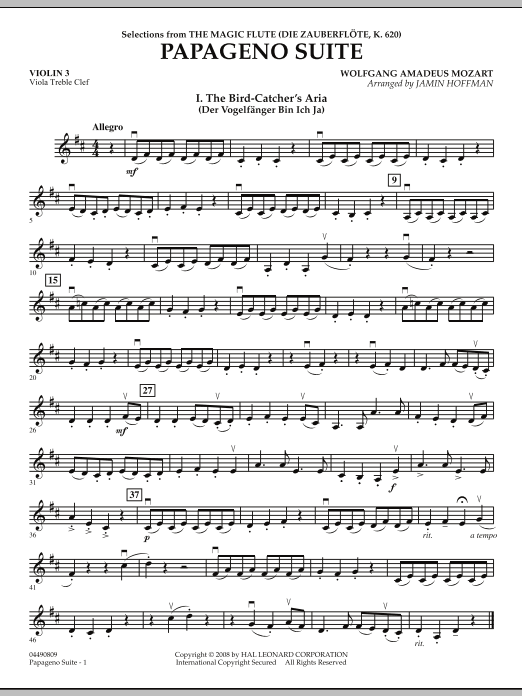 Here's a suite of three of the most charming arias from The Magic Flute (The Bird Catcher's Aria, Either Girlfriend or Young Wife, and Pa-pa-pa-pa); instantly recognizable, with solos for violin and cello, as well as optional parts for solo recorder, flute or piccolo, glockenspiel, and violin (also playable with string orchestra only).