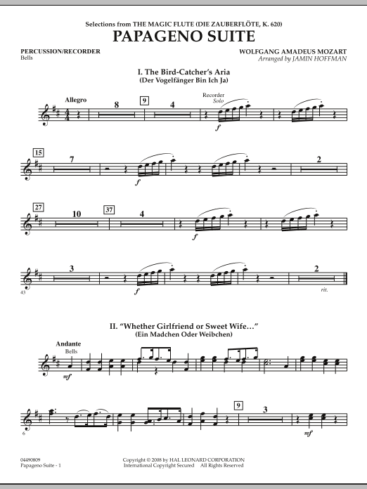 Here's a suite of three of the most charming arias from The Magic Flute (The Bird Catcher's Aria, Either Girlfriend or Young Wife, and Pa-pa-pa-pa); instantly recognizable, with solos for violin and cello, as well as optional parts for solo recorder, flute or piccolo, glockenspiel, and violin (also playable with string orchestra only).