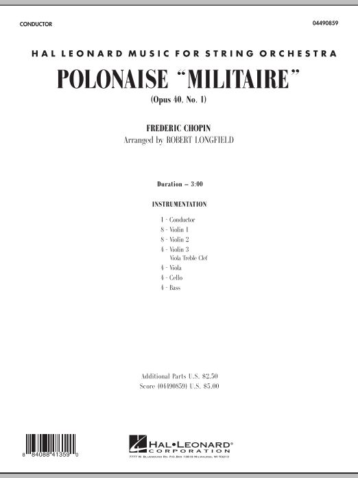 A regal and stately march that is remembered as one of Chopin's most popular piano works, Polonaise Militaire can be performed in a variety of settings, including as a graduation processional. Robert Longfield's arrangement is written in tutti style with interesting parts for all players, and includes ample dynamic contrast to give this movement dramatic musical style.