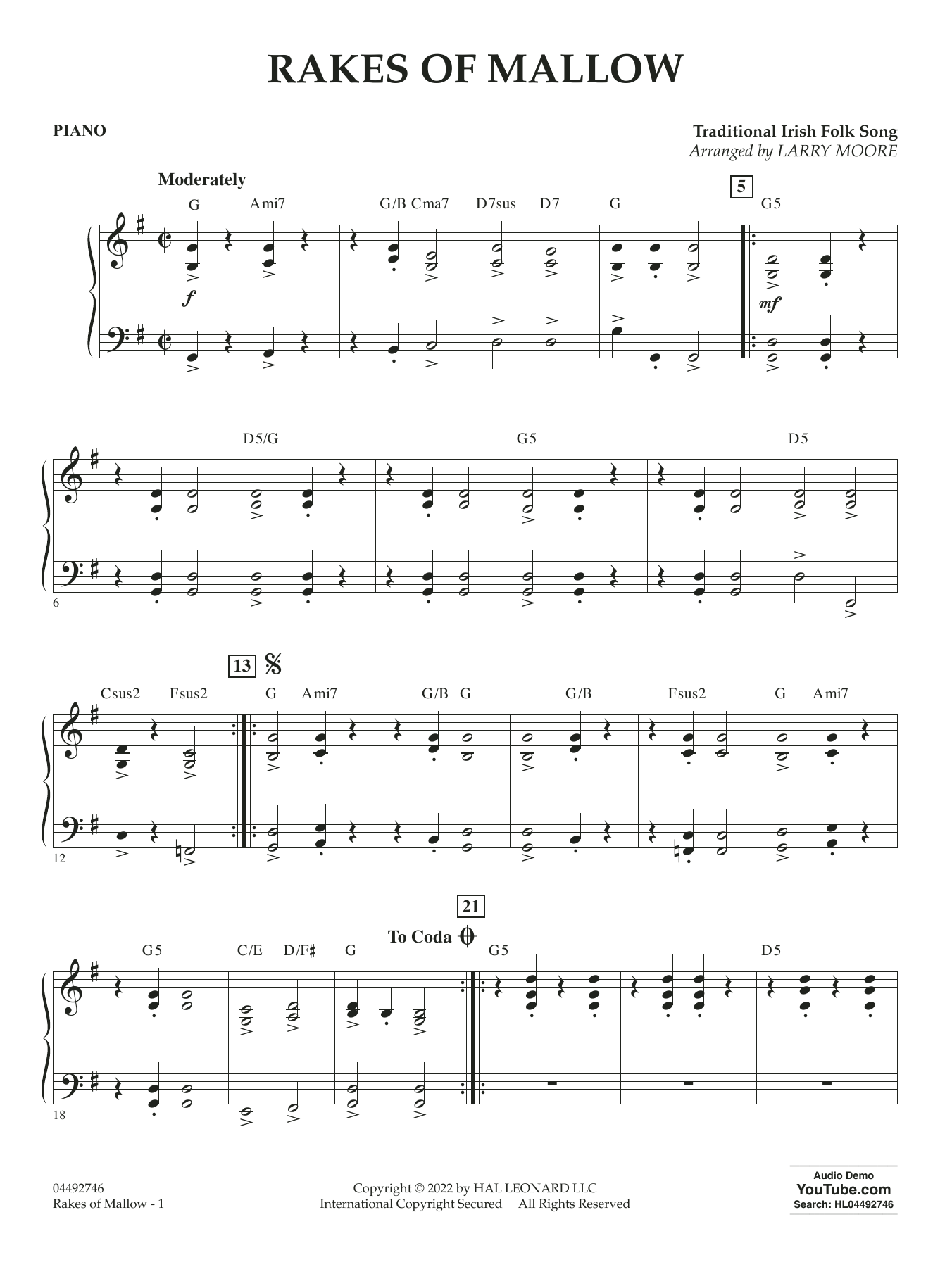 This iconic traditional Irish medley shines in this accessible arrangement by Larry Moore. Moore's cut-time version begins in G major and modulates to A major for the final section, providing much-needed experience with C-sharps and G-sharps!