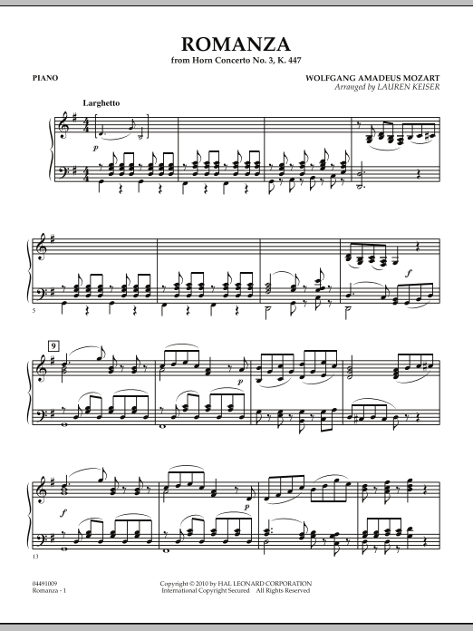 A famous theme from Mozart's horn concerto is adapted for strings with this new teaching and performance edition from Lauren Keiser. Treat your students to the genius of Mozart with this beautifully rendered orchestration for string ensemble.