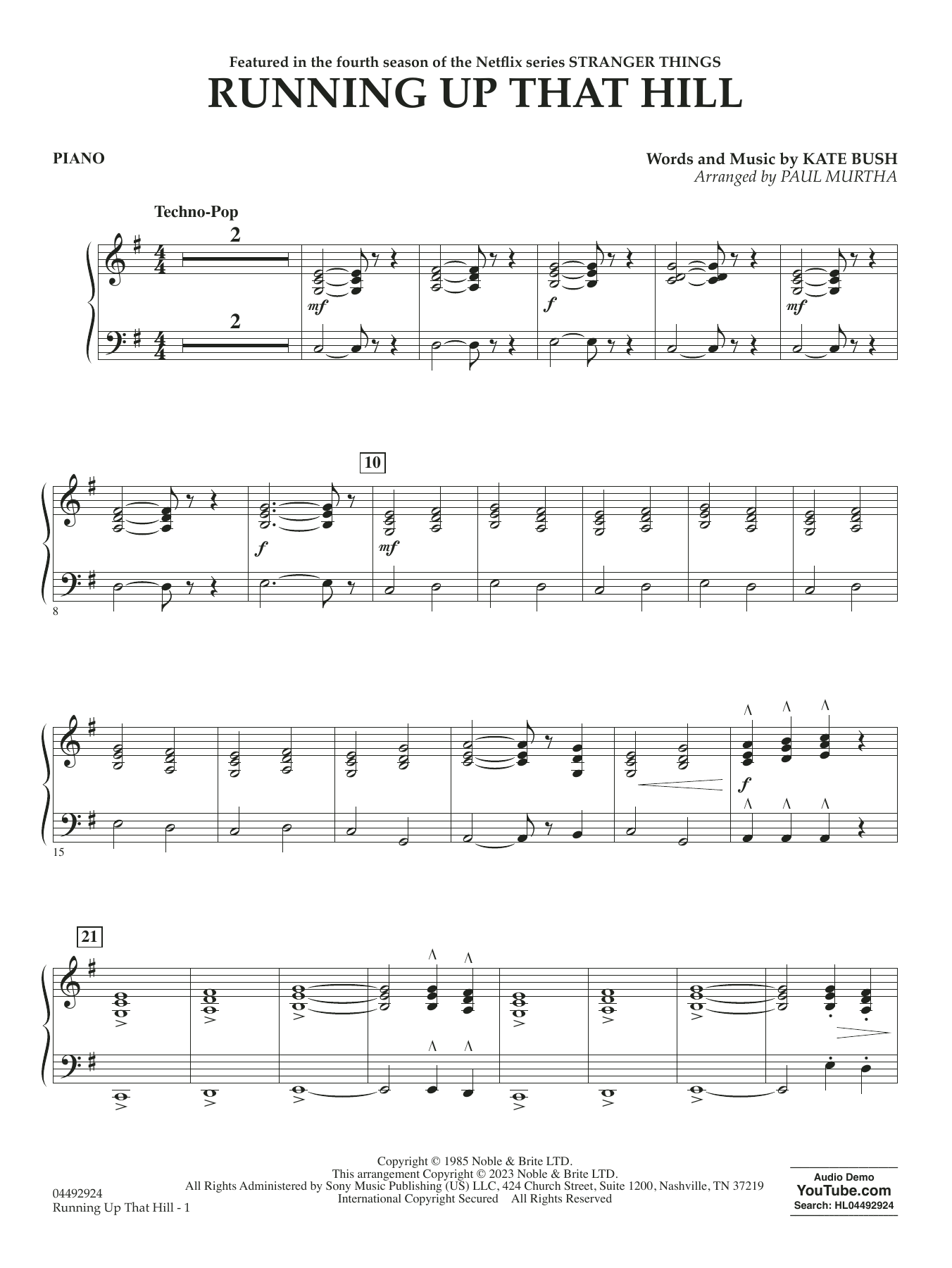 Das Wiederaufleben dieses Hits aus dem Jahr 1985 gibt einer neuen Generation von Musikern die Möglichkeit, die Kraft und Emotion von Kate Bushs Running Up That Hill in diesem Arrangement für Streichorchester von Paul Murtha zu erleben. Mit seinen treibenden Rhythmen und seiner stimmungsvollen Atmosphäre hinterlässt Running Up That Hill einen bleibenden Eindruck bei Interpreten und Publikum gleichermaßen. Erweitern Sie Ihr Repertoire mit diesem kraftvollen Arrangement und schaffen Sie eine unvergessliche Aufführung für Interpreten und Publikum gleichermaßen!