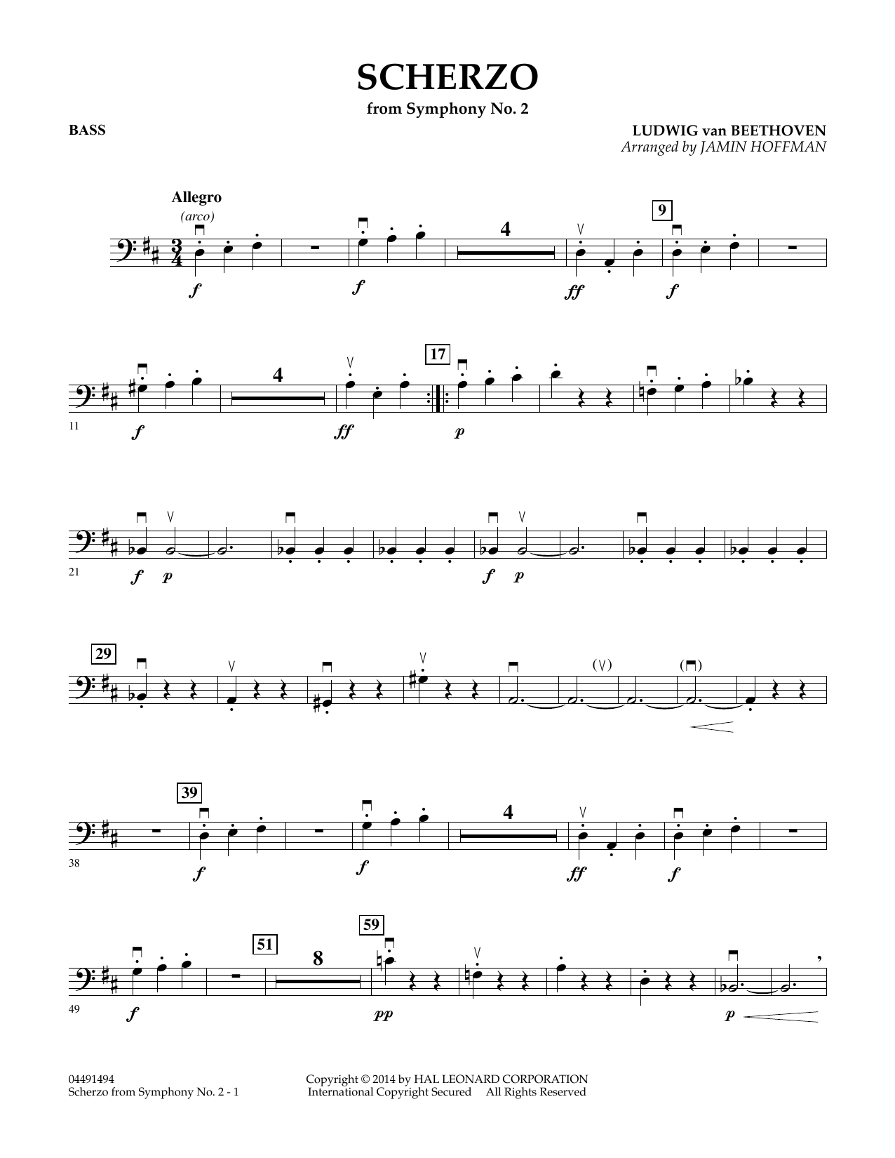 Jamin Hoffmans mittelschwere Bearbeitung von Beethovens Scherzo aus der Sinfonie Nr. 2 enthält neben der Partitur folgende Stimmen: Violine 1 (8), Violine 2 (8), Violine 3 (4), Viola (4), Cello (4), Kontrabass (4), Klavier (1), Pauken (1).