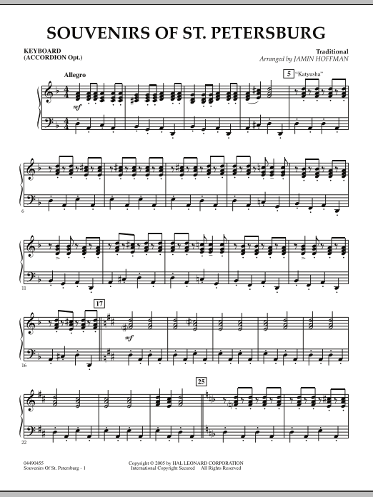 This medley of folk songs came from a recent trip to Russia by arranger Jamin Hoffman. Katyusha, Moscow Evenings, and Kalinka are all rich in tradition, each with a distinctive taste of the land that has given the world so much important music.