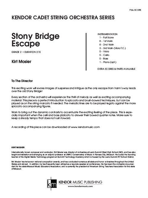 We welcome Kirt Mosier to the Kendor family of writers with this grade 2 original. This exciting work evokes images of suspense and intrigue as the only escape from harm's way leads over the old Stony Bridge! This piece is a perfect introduction to spiccato and brush-bowed technique. Duration 2:15. Available in SmartMusic