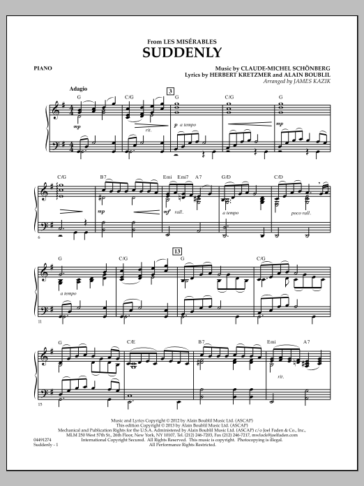 Composed especially for the film adaptation of Les Miserables and sung by Hugh Jackman ('Jean Valjean'), this song offers a beautiful and tender moment. Nicely scored for strings, this arrangement will sound full and confident with Jim Kazik's impressive arrangement.