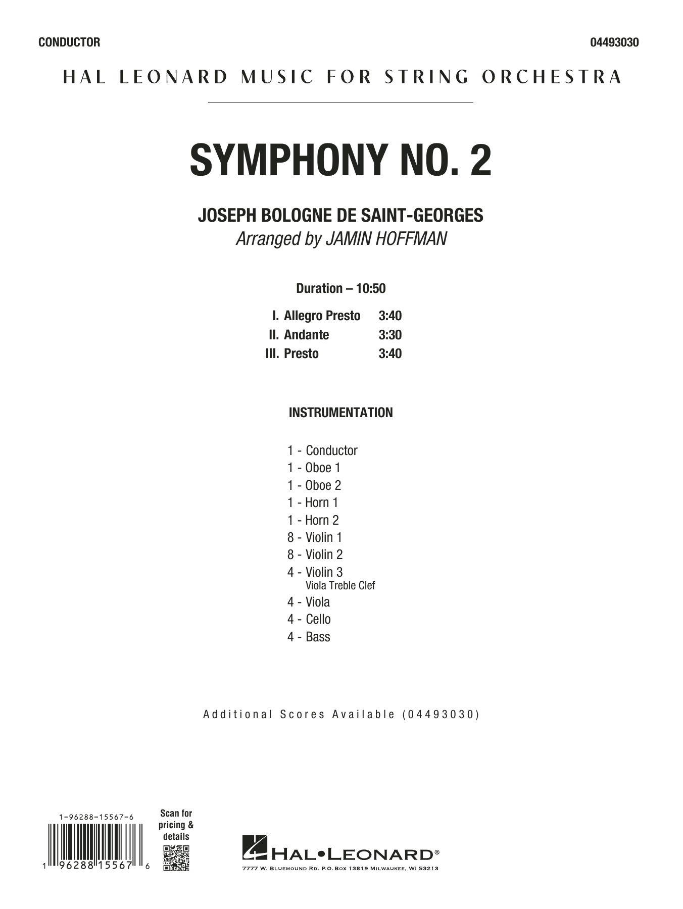 Jamin Hoffman hat das Originalmanuskript einer der beiden einzigen erhaltenen Sinfonien des Chevaliers sorgfältig bearbeitet, um dieses Meisterwerk des Schwarzen Mozart modernen Orchestern zugänglich zu machen. Diese längst überfällige Hommage an einen Meisterfechter, Offizier, Dirigenten und Komponisten gehört in jede Musikbibliothek! (Mit optionalen Oboen und Hörnern.)
