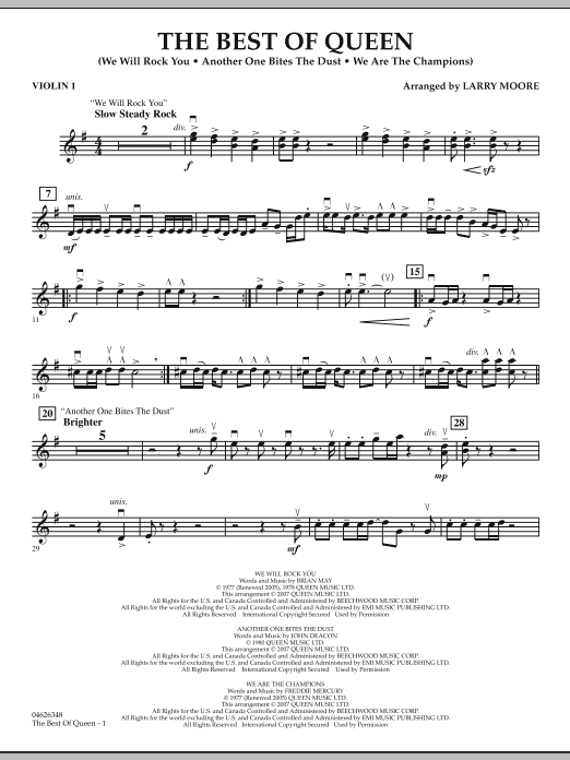 Here's a tribute to one of the legendary groups of all time that features three classic songs that defined Queen's place in pop music history. With Larry Moore's medley for strings, your orchestra can rock with the best of them playing songs that have become popular music anthems. Features: We Will Rock You, Another One Bites the Dust, and We Are the Champions.
