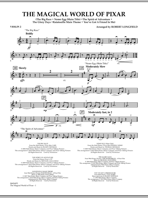 The unmatched creativity of Pixar Studios continues with blockbuster films that have become entertainment icons of our time. Each has a memorable musical score, several of which are combined into this terrific showcase for string orchestra. Includes: The Big Race (Cars), Nemo Egg (Finding Nemo), The Spirit of Adventure (Up), The Glory Days (The Incredibiles), Ratatouille (Main Theme), and You've Got a Friend (Toy Story).