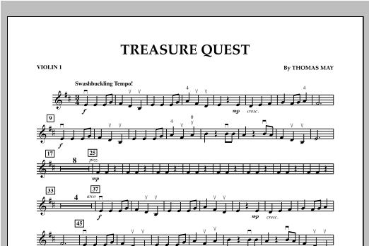 Students love great adventure music, and Treasure Quest is sure to please. A seafaring, swashbuckling tune in 3/4 with bold statements for all parts, this mini-overture by composer/string educator Tom May is a delight to learn and perform.
