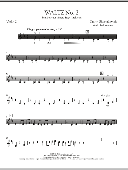 Shostakovich's waltz has become an international icon, made popular by artists like Andre Rieu and recently heard prominently in Stanley Kubrick's final film, Eyes Wide Shut. Taken from Shostakovich's Suite for Variety Orchestra, Paul Lavender's skilled adaptation is ideally suited for string orchestra, for both serious and light programming.