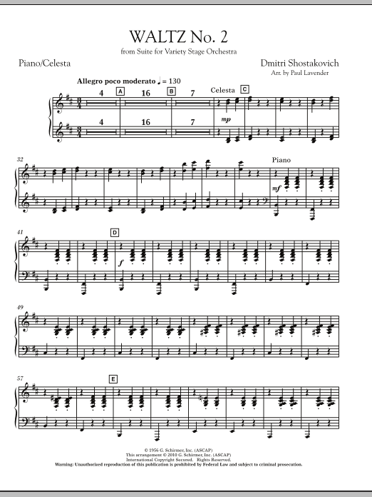 Shostakovich's waltz has become an international icon, made popular by artists like Andre Rieu and recently heard prominently in Stanley Kubrick's final film, Eyes Wide Shut. Taken from Shostakovich's Suite for Variety Orchestra, Paul Lavender's skilled adaptation is ideally suited for string orchestra, for both serious and light programming.