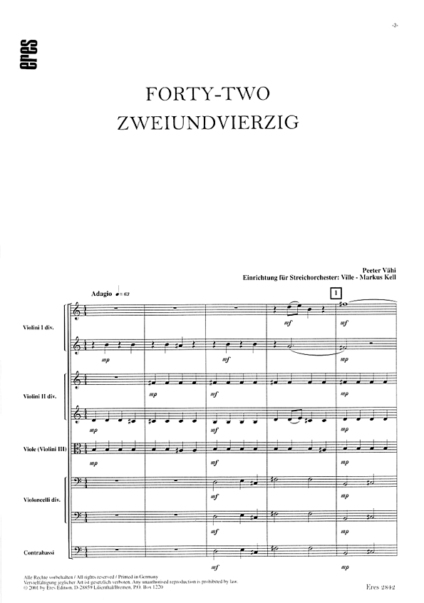 Ein wunderbares, einfühlsames musikalisches Thema, dieses '42', das Vähi für sich zu seinem 42. Geburtstag komponierte und Elvis Presley, Joe Dassin und Vladimir Vyssatsky widmete, die im 42. Lebensjahr verstarben. Fassung für Streichorchester von Ville-Markus Kell. Auff.-Dauer: ca. 4'30 min.Die Stimmen sind unter eres 2842.9 lieferbar.Die Originalfassung dieses Stückes ist geschrieben für Orgel und Oboe.Eres Estonia Editionáááá