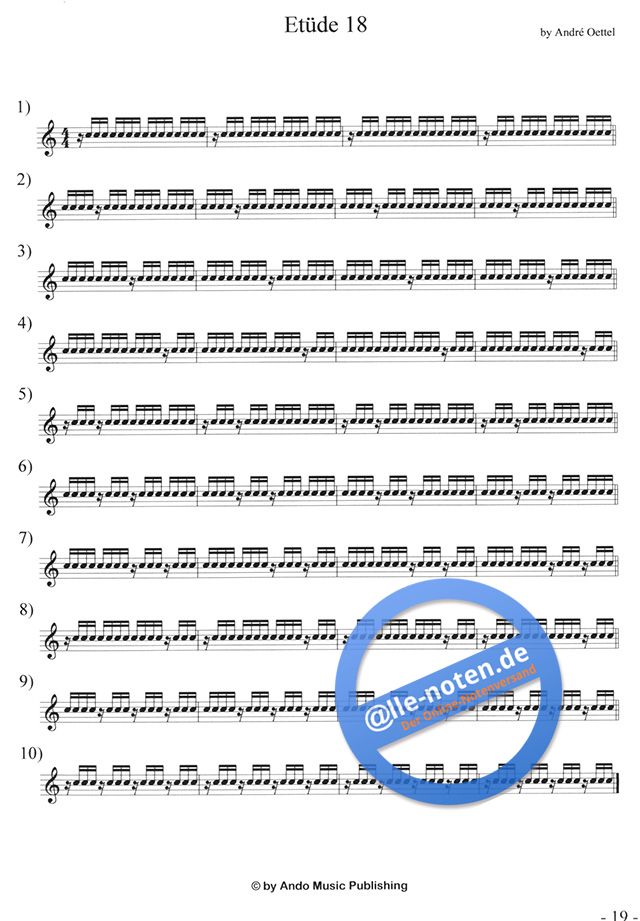 Eine Sammlung von 48 Übungsstücken. Ideal für den Anfänger für das Erlernen von Noten und Pausen, Rhythmik und Geschwindigkeit. Anfangend von Ganzen-, Halben- und Viertelnoten, bis hin zu Sechzentel-Pausen und Sechzentel-Sextolen. Diese Ausgabe beinhaltet keine Dynamik-Stufen.