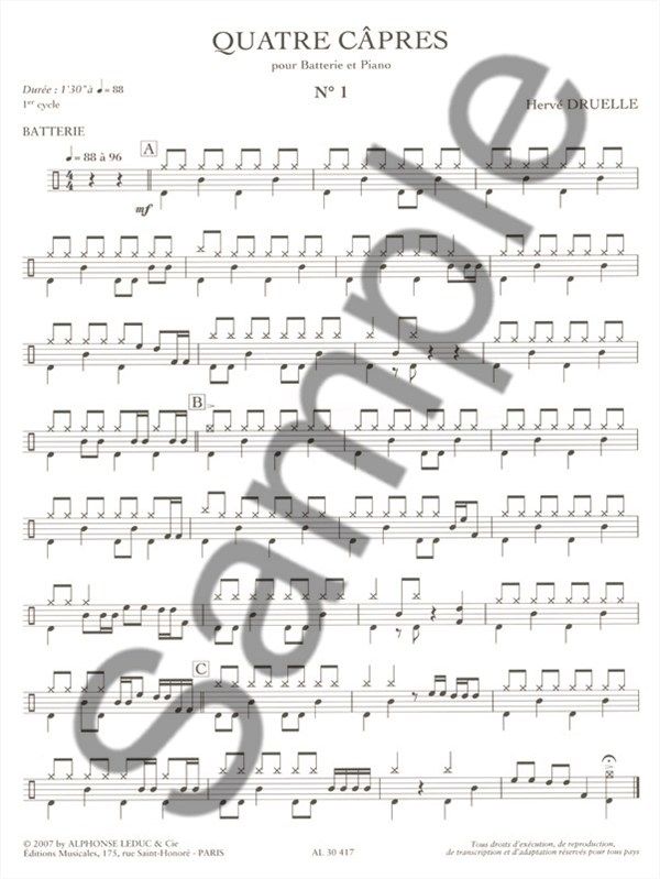 4 capres et 12 huitres (cycle 1) (chaque pièce : 1'30'') pour batterie et piano. Par Druelle aux éditions Leduc. Partition / Livre de chansons pour Batterie.