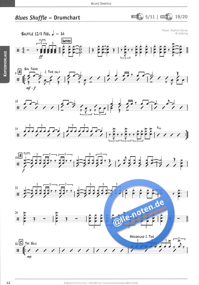 Bigband Drumming richtet sich an Drummer in Schul-Bigbands, Blaskapellen, Musikvereinen, Studentenorchestern etc. sowie an Dirigenten und Arrangeure. Sie erhalten im einführenden Theorieteil grundlegende und vertiefende Informationen rund um den Einsatz und die Funktion des Schlagzeugs in der Bigband. Dabei legt der erfahrene Bandcoach und Profi-Drummer Stephan Genze den Schwerpunkt auf notationstechnische Aspekte und erläutert mithilfe vieler Beispiele, was ein gutes Drumchart ausmacht. Mehr noch: Er demonstriert anschaulich, wie die reduzierte Drumset-Notation in unterschiedlichen musikalischen Kontexten optimal interpretiert wird.