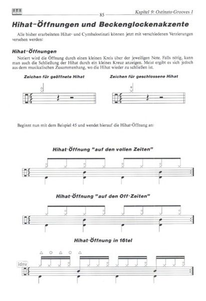 9. Kapitel: Ostinato-Grooves 1: Achtel- und 16tel-Feels, Basisgrooves / Four-on-the-Floor / Westcoast-Rock-Groove / - Rhythm & Blues / Soul / Dreiergruppen in 16teln als Groove / HiHat- und Cymbal-Ostinati