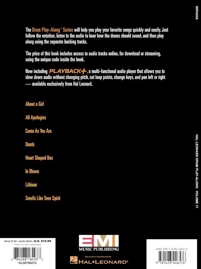 Play your favorite songs quickly and easily with the Drum Play-Along Series. Just follow the drum notation, listen to the Online Audio to hear how the drums should sound, then play along using the separate backing tracks. The lyrics are also included for quick reference. The audio Online Audio is playable on any Online Audio player, and also enhanced so PC & Mac users can adjust the recording to any tempo without changing the pitch! Includes 8 great Nirvana anthems: About a Girl - All Apologies - Come as You Are - Dumb - Heart Shaped Box - In Bloom - Lithium - Smells like Teen Spirit.