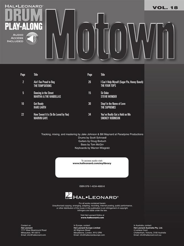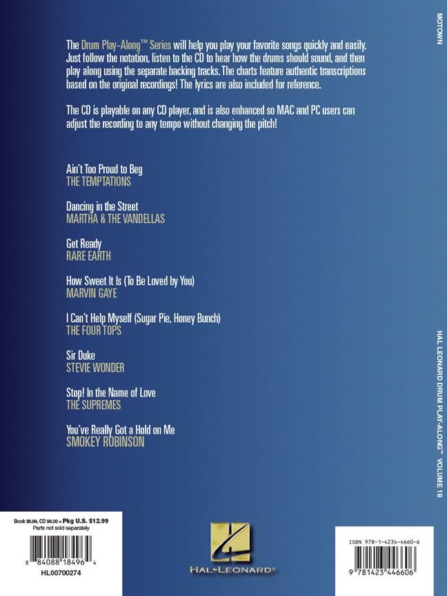 Play your favorite songs quickly and easily with the Drum Play-Along series! Just follow the drum notation, listen to the Online Audio to hear how the drums should sound, then play along using the separate backing tracks. The lyrics are also included for quick reference. The audio Online Audio is playable on any Online Audio player, and also enhanced so PC & Mac users can adjust the recording to any tempo without changing the pitch! 8 Motown hits, including: Ain't Too Proud to Beg - Dancing in the Street - Get Ready - How Sweet It Is (To Be Loved by You) - I Can't Help Myself (Sugar Pie, Honey Bunch) - Sir Duke - Stop! In the Name of Love - You've Really Got a Hold on Me.
