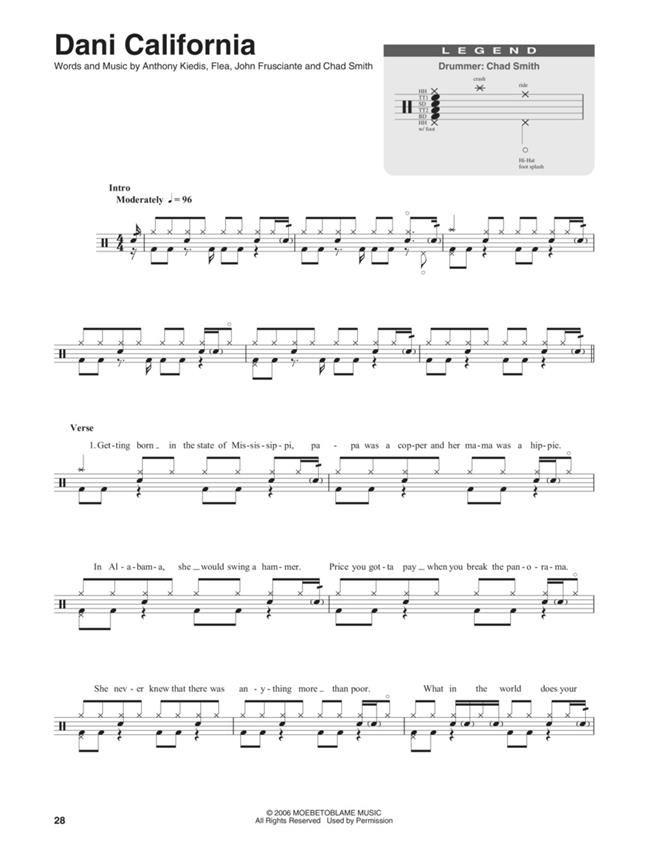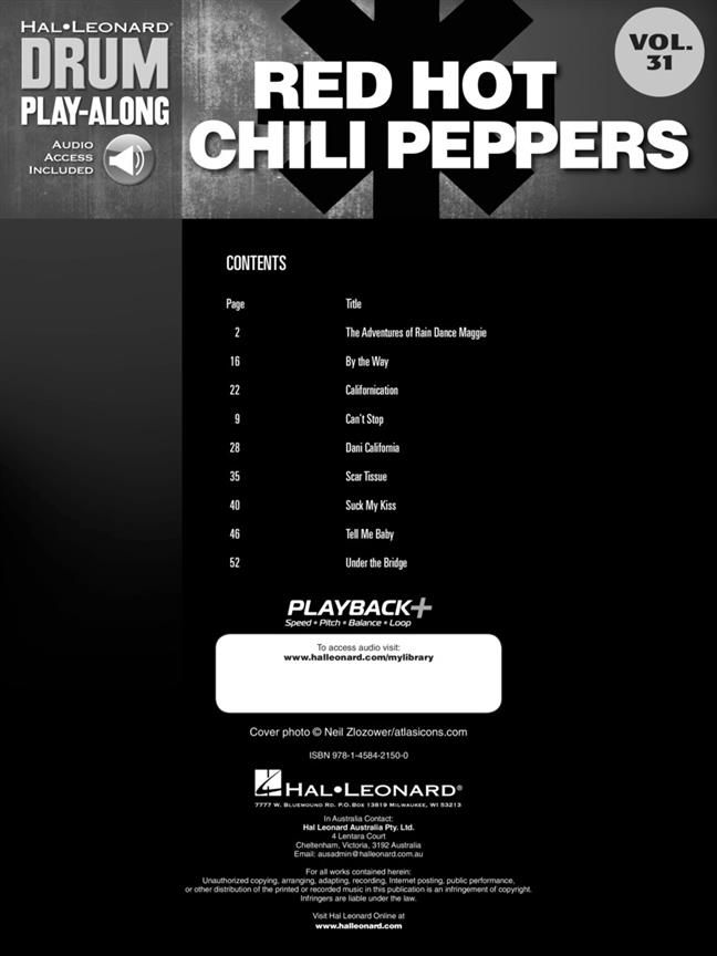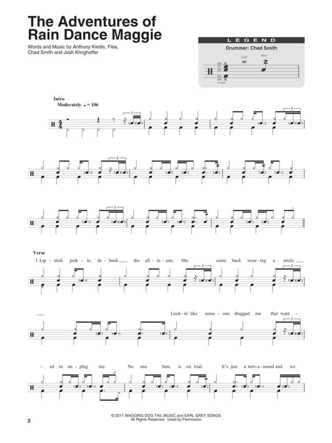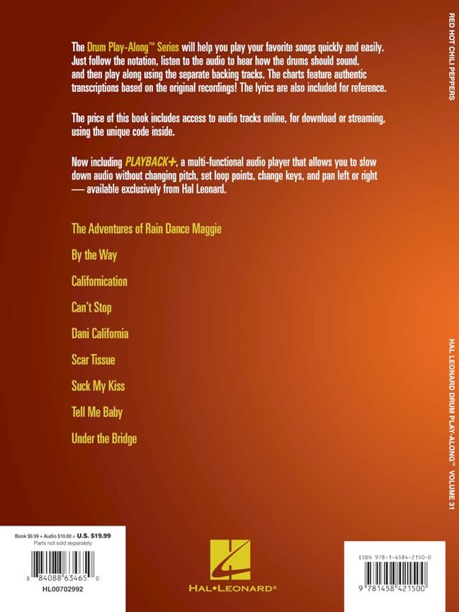 Play your favorite songs quickly and easily with the Drum Play-Along series! Just follow the drum notation, listen to the Online Audio to hear how the drums should sound, then play along using the separate backing tracks. The lyrics are also included for quick reference. The audio Online Audio is playable on any Online Audio player, and also enhanced so PC & Mac users can adjust the recording to any tempo without changing the pitch! Rock out like Chad Smith to these favorites from the Chili Peppers: The Adventures of Rain Dance Maggie - By the Way - Californication - Can't Stop - Dani California - Scar Tissue - Suck My Kiss - Tell Me Baby - Under the Bridge.