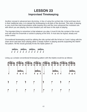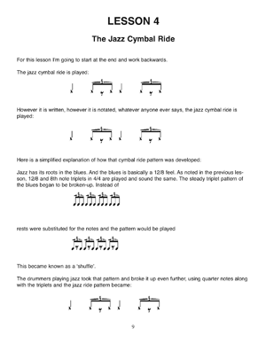 This book is designed for the drummer who has had some experience playing other styles of music but has a desire to learn some techniques and styles of jazz. It is assumed the reader has a knowledge of notes, measures or bars, time signatures, musical notation, and drum notation. A knowledge of the drum rudiments is also desirable. Though the book is meant as an overview to teach basic and essential jazz techniques, it will take someone who is willing to put in the time and practice from being a total jazz novice to the level of being a competent drummer in the jazz idiom. In addition to learning the essential knowledge required to play jazz, the student will also accomplish many intermediate and advanced techniques. I should note that I wrote this book EXACTLY as I teach jazz drumming techniques in my private lessons. This system has been developed and refined over the years and has given excellent, proven results that have produced some fine drummers, many of whom went on to build careers playing and teaching jazz. I am hoping that this book will inspire the reader and student to delve further into the jazz idiom and develop his or her technique and knowledge to the highest level. And even if the student goes no further in the jazz idiom, I am confident that the book will open doors to other avenues that the drums can take and will be benefit the reader in any style of music he or she chooses to play.