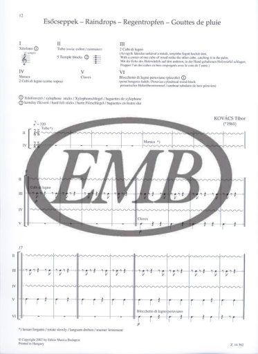 This volume is exceptional within the series, these original compositions for percussion include only contemporary works, to be precise, four works by three composers, for four, five and six performers. Each one of them is a successful piece, well-tried in practice. László Borsody (b. 1944) Fugue for four percussionists, László Zempléni (b. 1947) Squirrel-quartet, Tibor Kovács (b. 1961) Raindrops, On the monotonous train.