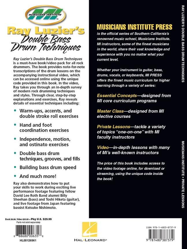 The book provides note-for-note transcriptions of the drum lessons on the accompanying instructional video, which can be accessed online at halleonard. com via a unique code in the book. In the video, Ray takes players through an in-depth survey of modern rock drumming techniques and styles. Through clear, step-by-step explanations and exercises, he reveals details of essential techniques, including: warm ups, accents and double stroke rolls - hand and foot coordination - independence, motion and ostinato - double bass drum techniques, grooves & fills - building bass drum speed - and more! Ray demonstrates how to put these skills to work during exciting live performance footage featuring fellow David Lee Roth Band alumni Billy Sheehan (bass) and Toshi Hiketa (guitar), and live footage from Japan featuring Keisuke Nishimoto.