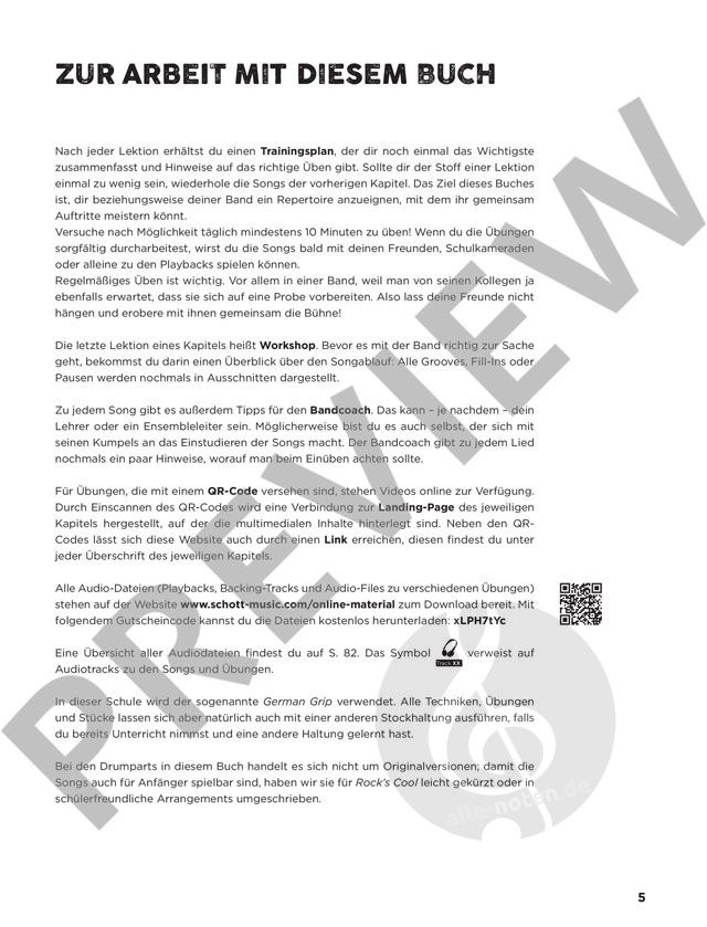 In Rock's Cool Drums werden die Grundlagen des Schlagzeugspielens anhand von acht bekannten Rock-Hits vermittelt. Der Schüler lernt die korrekte Haltung und die grundlegende Spieltechnik am Drumset. Außerdem beginnt er/sie mit dem Noten lesen und lernt erste Rock-Grooves am Drumset. Nahezu alle Übungen sind auch als Video verfügbar und können online gestreamt werden. Dazu gibt es praktische Playback-Tracks in verschiedenen Geschwindigkeiten, mit oder ohne Schlagzeugspur. So wird der Schüler zum sicheren Drummer und Bandmusiker ausgebildet. Preisträger des Deutschen Musikeditionspreis (Best Edition) 2020.