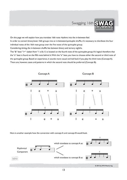 Das Swag-Drumming als Inspirationsquelle für unzählige Drummer geht auf eine traditionelle Spielweise zurück, die im New Orleans Swingfeel entstand und sich mit dem Inbetween-Feel an die heutigen HipHop- und Pop-Grooves angepasst hat. Diese Spielart definiert sich als ein Rhythmus, der zwischen einem binären und ternären Rhythmus liegt. Weil die Wahl von Quintolen diesem Feel am nächsten kommt, haben die Autoren eine greifbare Methode gefunden, diese komplexen Rhythmen auf eine spielerische Art dem Schlagzeuger näher zu bringen.