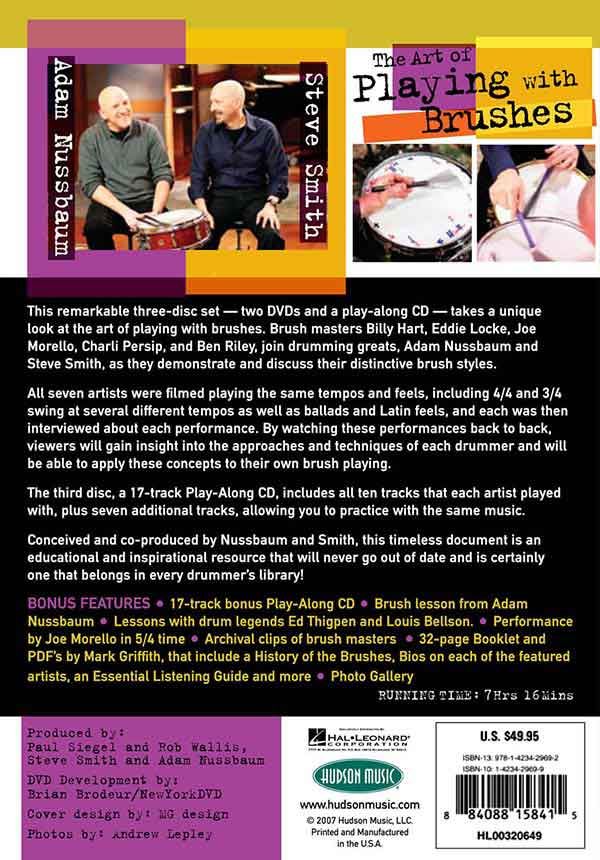 This remarkable three-disc set - two DVDs and a play-along CD - takes a unique look at the art of playing with brushes. Brush masters Billy Hart, Eddie Locke, Joe Morello, Charli Persip, and Ben Riley, join drumming greats, Adam Nussbaum and Steve Smith, as they demonstrate and discuss their distinctive brush styles.