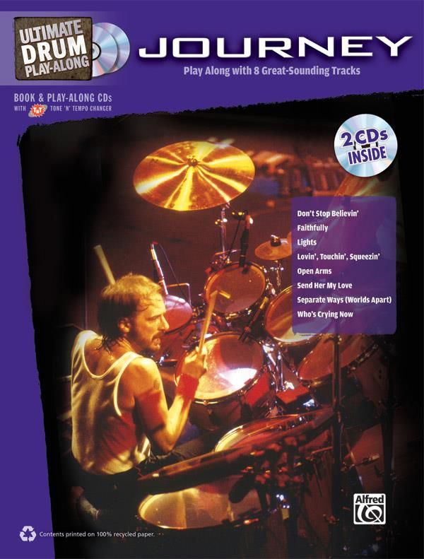 Alfred's Ultimate Play-Along series gives you everything you need to jam with your favorite songs. This book contains exact drum transcriptions, music notation, lyrics, and chords to eight Journey classics. For your convenience, in addition to the complete song charts, drum-only charts are included in the book and printable PDF versions are embedded on the provided enhanced CDs. There are two audio versions of every song on the included CDs: an instrumental sound-alike recording, and an instrumental accompaniment track without drums so you can play along. When you use the CDs in your Mac or Windows-based computer, the TNT (Tone 'N' Tempo) Changer lets you access three versions of each song: the full-instrumental sound-alike, the instrumental accompaniment without drums but with a constant click track, and the instrumental accompaniment without drums and without a click track. Plus, the TNT software allows you to easily loop sections for practice, slow tracks down or speed them up without changing the pitch, change the key, and switch back and forth between the full-instrumental and play-along tracks.