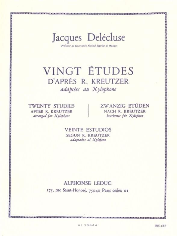 Twenty Studies R. Kreutzer arranged by Jacques Delécluse (born 1933) is a set of twenty studies written for Xylophone. Inspired by a set of exercises for Strings written by Kreutzer, Twenty Studies after R. Kreutzer coverspassages that would often be seen in modern orchestral music. Rudolphe Kreutzer was a French violinist, conductor and composer, and the author Jacques Delécluse, is a soloist at the Paris Orchestra and a professor at the ParisConservatoire. He has conceived a keyboard-percussion instrument that holds his name, and is also the author of a series of seven books ' la manière de' for Drums and Piano.