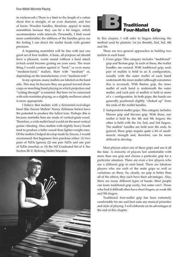 This book contains a lot of music, from musical etudes designed for beginning and intermediate players to recital material appropriate for intermediate and advanced players. This book includes: Examples takne from contemporary solo and chamber works for Marimba with Nancy's commentary and performance tips. 50 studies that will develop essential four-mallet technique in a musical way. 18 sols that appropriate for recitals, auditions, or juries, including works by Beethoven, Handel, Debussy, Leonard Bernstein and Duke Ellington. Guidelines for mallet selection, four-mallet grip, strokes, tone production, rolls, stickings, phrasing, building a personal repertoire and other topics that are crucial for today's successful marimbist.